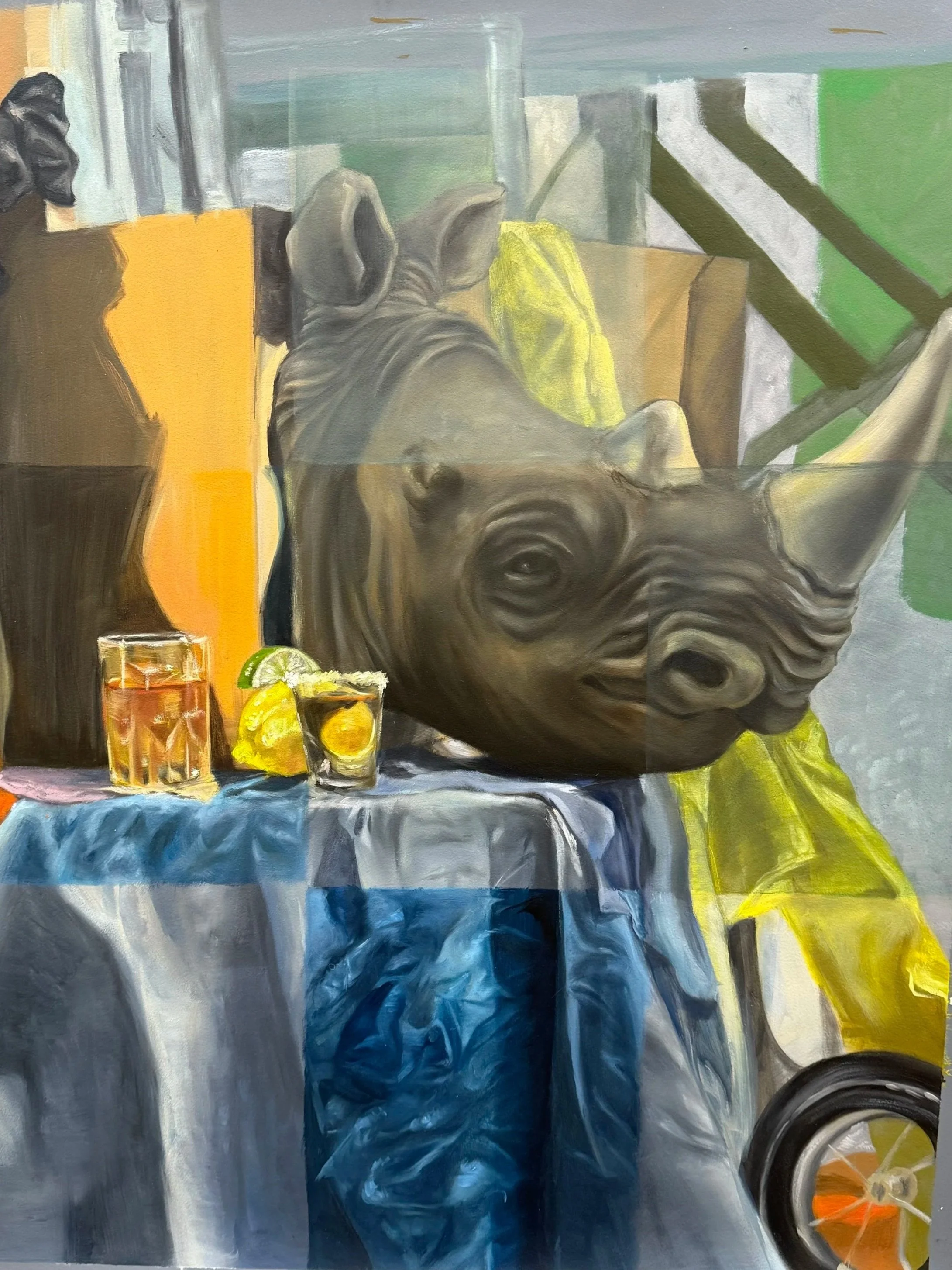 Rhino Happy Hour, still life study, 2025, 30 × 40 in, oil on paper