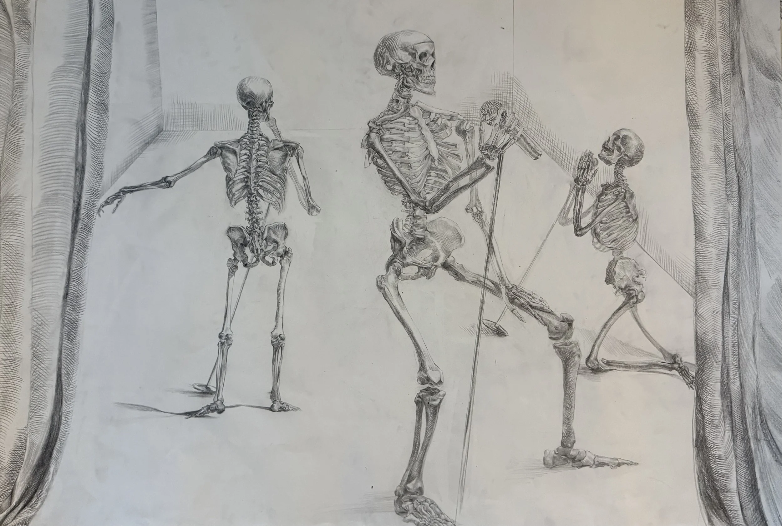 Skeleton Serenade, 2025, 30 × 40 in, graphite on paper