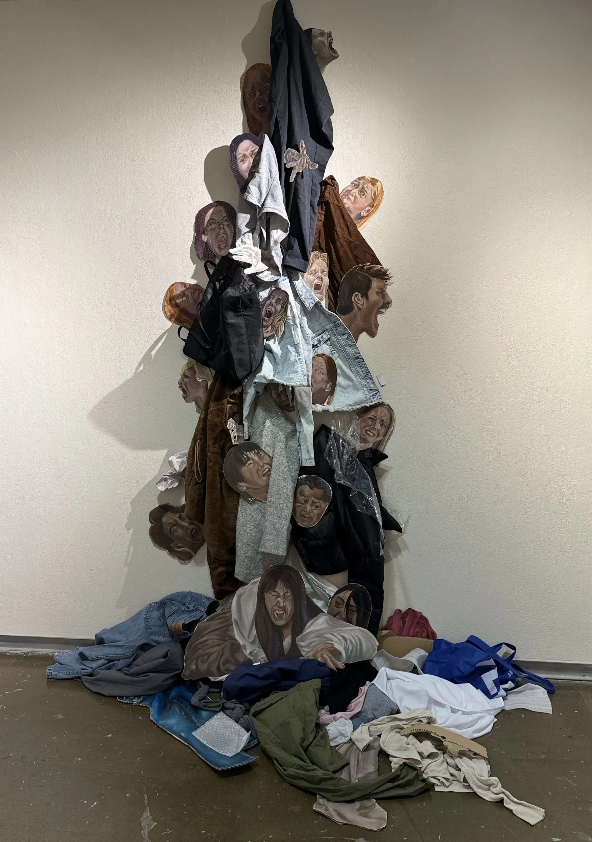Consumption, 2025, 5 × 12 ft, oil on cardboard, recycled clothing, trash